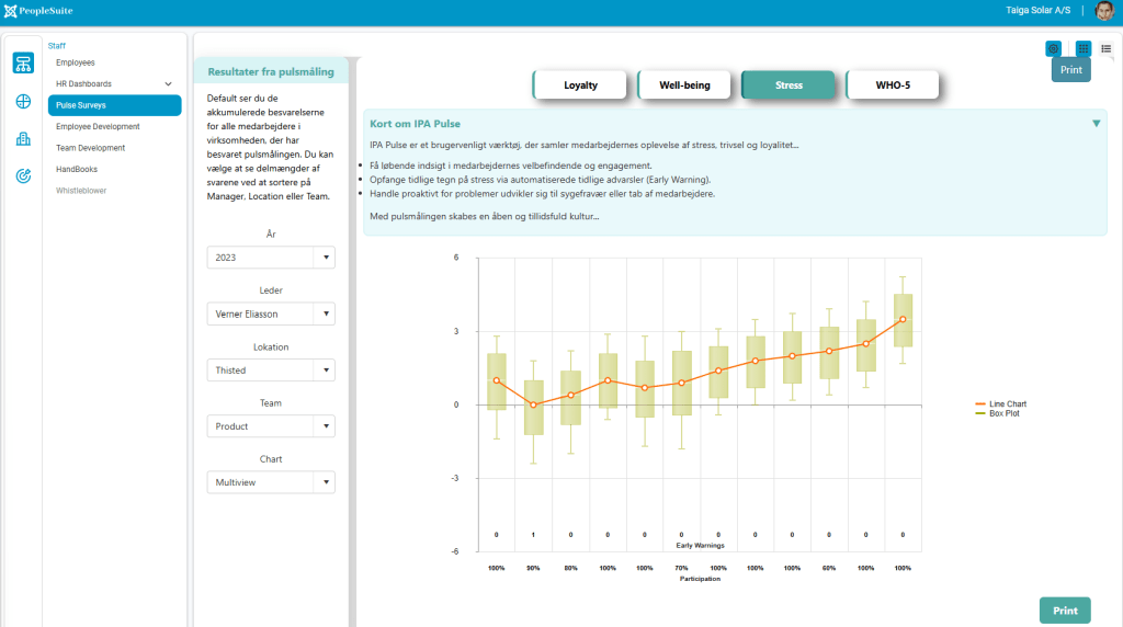 Skab indsigt i medarbejdernes trivsel og handle hurtigt, når det gælder. Med IPA PeopleSuite HR får I et samlet overblik over medarbejderoplevelsen og kan arbejde proaktivt med trivsel, stress og engagement. Modulet giver jer de rette værktøjer til at tage temperaturen på organisationen og skabe et stærkere fundament for både medarbejdere og ledelse.